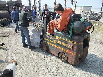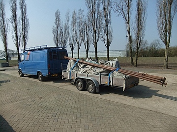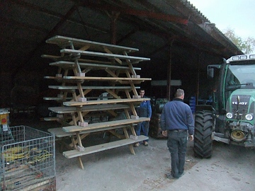 02-04-2011 De materialen voor de bouw van het podium worden aangesleept. Alles wordt in goed overleg volgens tekening samengesteld.