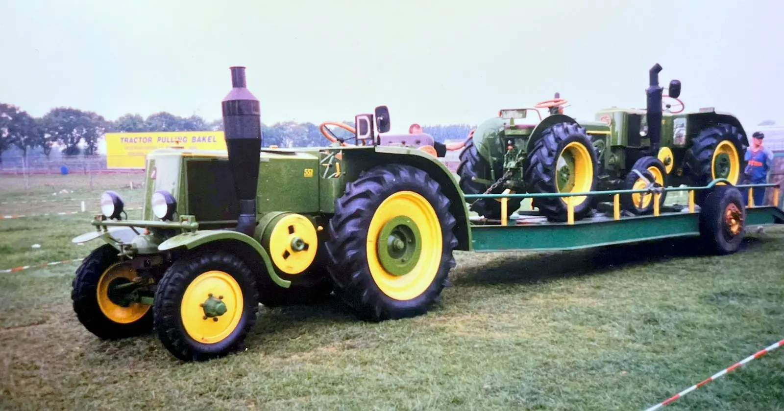 Foto: Op de voorgrond de tweecilinder Schlüter S25 uit 1962. Helemaal links op de foto bij Lanz tractor met witte hoed, Jan van Heuven, met zwarte pet Jurgen Minten, naast René van Heuven en op de brommer Coen Verhoeven.